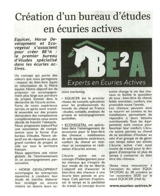 BE2A vous accompagne de A à Z dans votre projet de structure équestre. Cheval Mag en parle dans cet article.